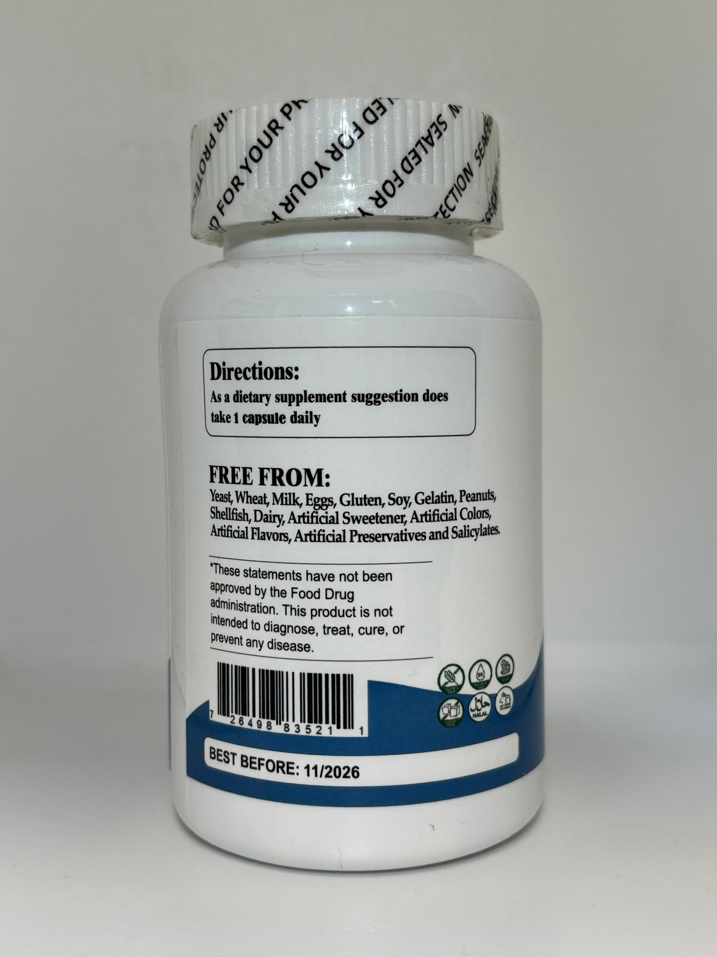 Frei von: Hefe, Weizen, Milch, Eiern, Gluten, Soja, Gelatine, Erdnüssen, Schalentieren, Milchprodukten, künstlichen Süßungsmitteln, künstlichen Farbstoffen, künstlichen Aromen, künstlichen Konservierungsmitteln und Salicylaten.