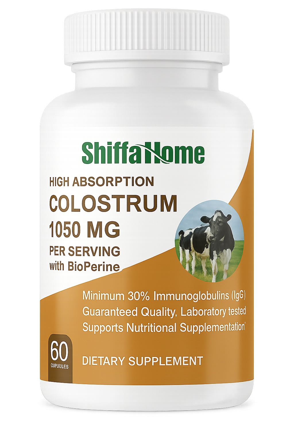 Shiffa Home Colostrum delivers 1050 mg of premium-quality colostrum per serving, combined with BioPerine® to enhance nutrient absorption. Each capsule provides a guaranteed minimum of 30% immunoglobulins (IgG), helping to naturally support the immune system and promote gut integrity.