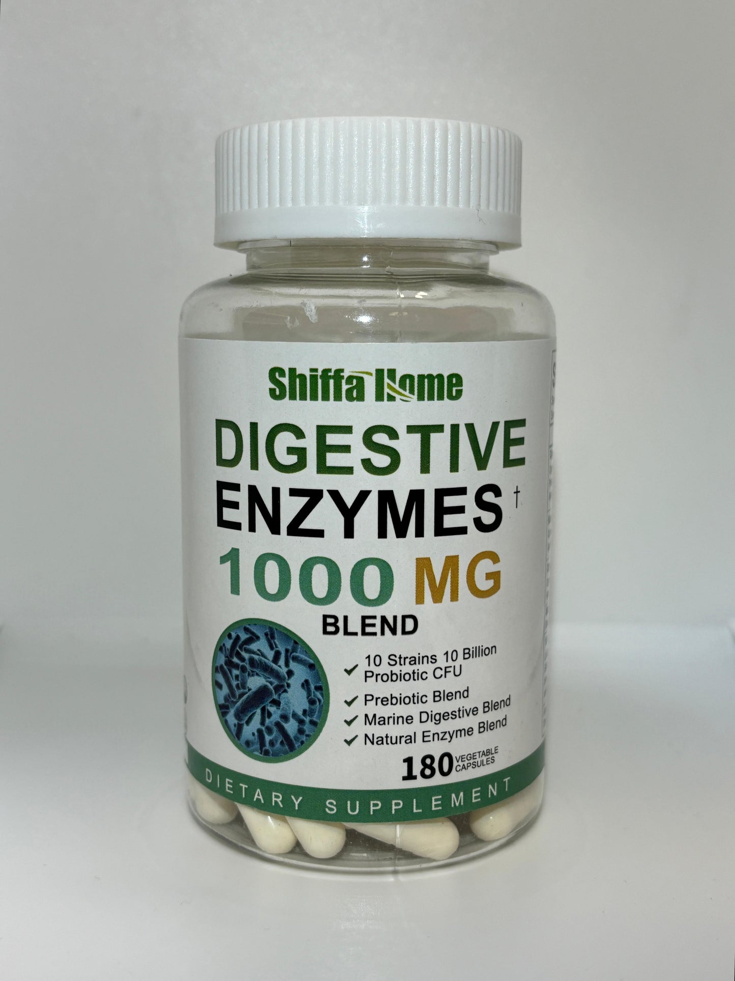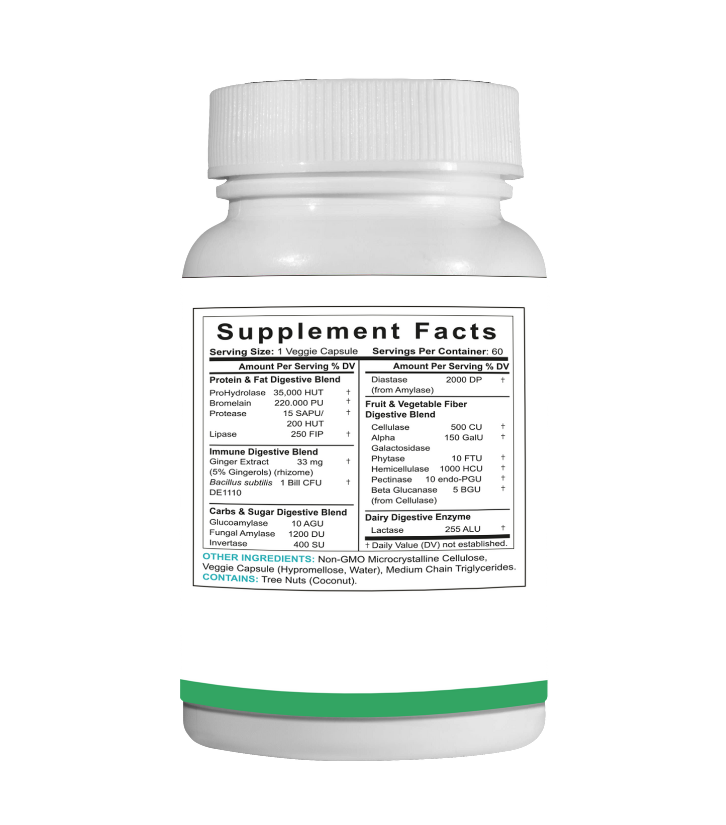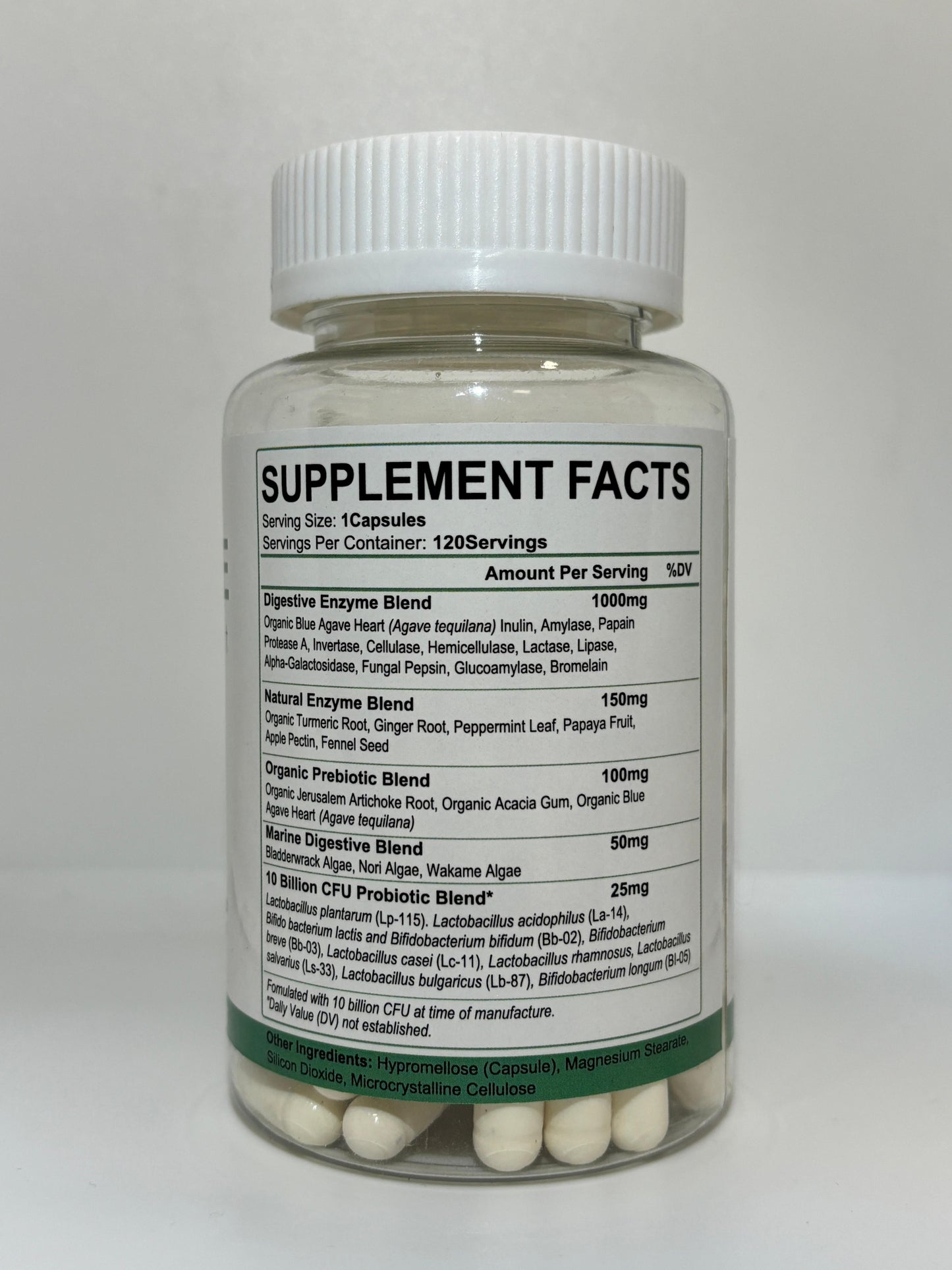 Digestive Enzyme blend 1000mg : Organic blue agave heart Inulin, amylase, Papain Protease A, Invertase, Cellulase, Hemicellulose, Lactase, Lipase, Alpha-Galactosidase, Fungal Pepsin, Glucoamylase, Bromelain