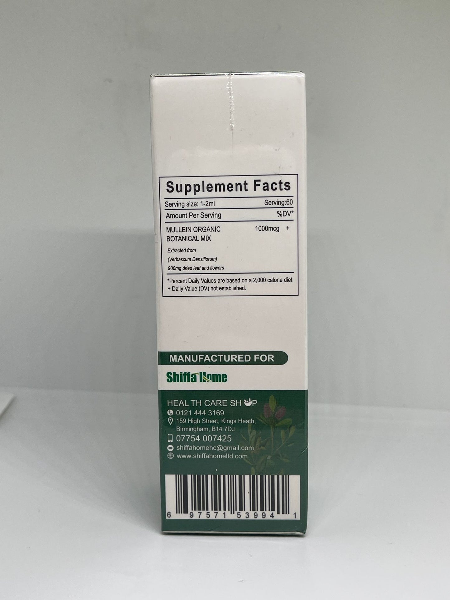 Ingredients: Organic Mullein 1000mcg , botanical mix extracted from ( verbascum densiflorum), 900mg dried leaf and flowers.